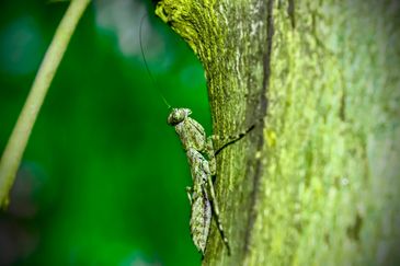 This beautiful and unique little mantis species beautifully mimics moss or lichen as it rests on trees and branches. They prefer to rest on trees in a downward position, pressed flat against the bark while waiting to ambush prey